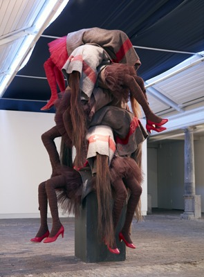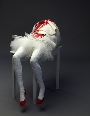 “Het komt voort uit mijn jeugd. Mijn vader was huisarts en tijdens de uitjes met ons gezin was hij verplicht zijn EHBO koffertje mee te nemen. Op een dag onderweg naar Ouwehands Dierenpark Rhenen gebeurde er een ongeluk. Mijn vader moest uitstappen en kijken of hij hulp kon bieden. Wij balen natuurlijk, ons uitje ging niet door. Dat waren enge momenten voor mij. Je zag iemand onder een deken liggen, alleen de benen nog zichtbaar en je dacht: is ie dood? Heel beklemmend. Dat beeld heb ik willen scheppen. Objecten in een deken, zonder gezicht, alleen benen die er uit steken. Totaal onduidelijk wat er in zit. Ik ben ook geïnspireerd geraakt door de periode dat ik als kunstenaar in een psychiatrisch centrum in Den Dolder verbleef, voor het project ‘Artist in Residence’. Daar zag ik mensen die zich echt gedroegen als dieren. Die mensen zijn niet menselijk meer, ze gaan gedrogeerd door het leven. Ze praten en leven als beesten en zitten in isoleercellen. Dat heb ik verbeeld met deze in dekens ingepakte figuren.”