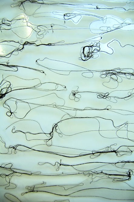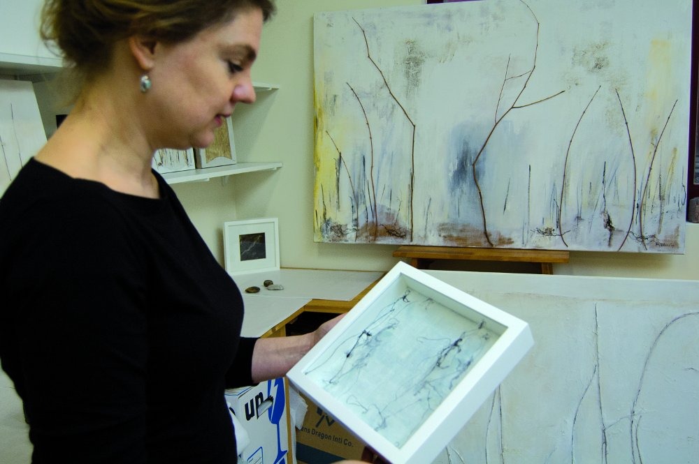 “Ik maak voornamelijk installaties en materieschilderijen. Met gelaagde werken op hout, glas of doek, schep ik ruimte. Mijn installaties krijgen door de schaduwwerking gelaagdheid. Afhankelijk van waar je staat en de lichtinval, ervaar je verschillende dieptes. Bij mijn materieschilderijen breng ik meerdere lagen papier aan op het doek of voeg stro, draad en takken toe. Zo krijg je letterlijk reliëf. Ik gebruik zand, verf en zelfs meegenomen as uit mijn kolenkachel in China. Door er met een penseel in te krassen ontstaat beweeglijkheid en door de verschillende verflagen ontstaat gelaagdheid. Ik ben gefascineerd door het aanbrengen van lagen, ze weg te halen en weer opnieuw aan te brengen.”