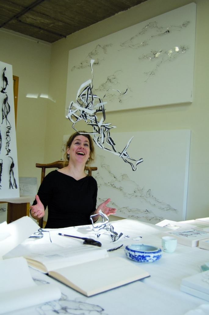 Op tafel staan een vaas met takken en een Chinees bakje met daarop een blauwe draak. Maartje schenkt jasmijnthee en serveert bonbons op een schaaltje uit de door haar ontworpen servieslijn. Ze pakt een boek met foto’s van haar werk. Voorin staat een gedicht van Lucebert: ‘Visser van Ma Yuen’. Een tekst waar ze veel inspiratie uithaalt over wolken, vogels, golven en vissen. “Het is gebaseerd op een dertiende-eeuws Chinees schilderij, ik vind het een prachtig gedicht. Het is niet echt duidelijk wat er met de woorden bedoeld wordt, maar dat is juist zo mooi. De sfeer, het ritme en de suggestie raken je. Hier speel ik zelf ook graag mee. Ik wil dat de beschouwer iets ervaart in het werk, zonder dat ik zeg wat dat is. Dat kan een moment van verstilling zijn of van ontroering. Het is altijd mooi als mensen kalm, boos, verdrietig of blij worden van kunst. Toen ik 16 jaar was, had ik zelf een moment van verstilling bij een werk van Rothko. Ik kon het niet uitleggen, maar het gaf me rust en daar ben ik altijd naar op zoek in de natuur en in poëzie. Als ik kunst maak, ervaar ik het.”