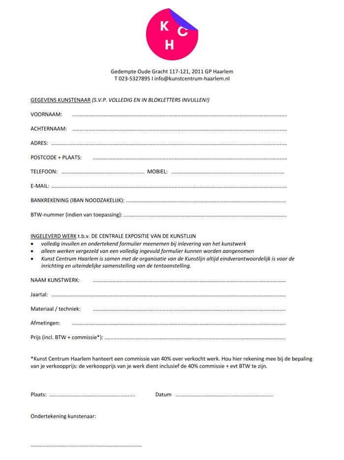 Lever het expositieformulier gelijktijdig in met je werk. Vermeld daarop de naam van de kunstenaar, telefoonnummer, de naam van de rekeninghouder (IBAN), het btw-nummer en de verkoopprijs (incl. BTW en 40% commissie voor Kunst Centrum Haarlem).