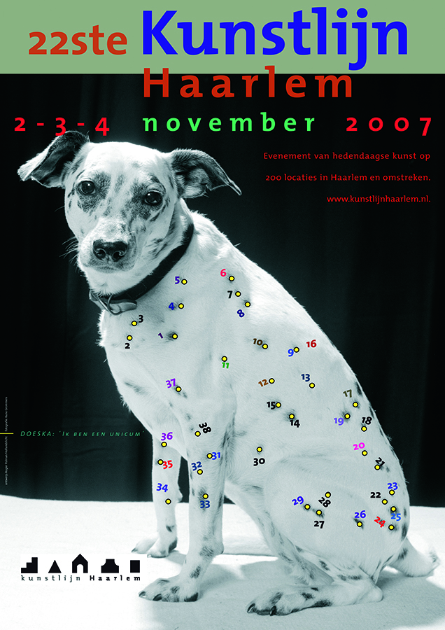 Na het ontwerpen van een duidelijk herkenbaar beeldmerk in 2001, de vijf grafische Haarlemse huisjes op een rij, startte de organisatie ook met het gebruik van een thema. De Kunstlijn kreeg in 2003 als thema ‘Grenzen’. Op het affiche stond een pitbull die de kunst bewaakte. De Kunstlijnhond was geboren en bleek een uiterst bruikbare mascotte.