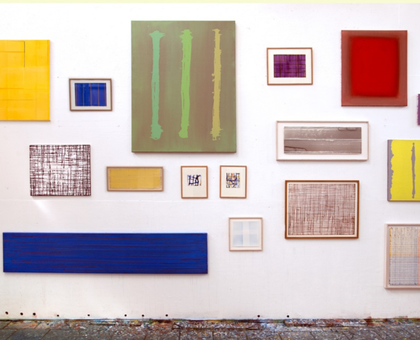 Eric is in gelaagde vlakken gaan werken, liet het toeval van het moment toe, draaide en kantelde de natte doeken, zag hoe de zwaartekracht een verfdruppel beïnvloedde, trok lijnen die een weefwerk van beweging te weeg brachten en hij werd druipende verf, verzadigd van vulstoffen en bindmiddelen, de baas. Hoe hij dat voor elkaar heeft gekregen is nu te zien op dit overzicht. De stilte en de rust dat zijn werk gekregen heeft is een optimale uitkomst van een levenslange ontwikkeling. Voor de kijker blijft het een voortdurend feest, waarbij een diepe buiging voor onze vriend niet mag ontbreken.