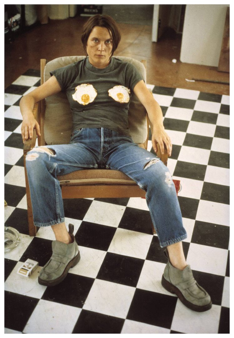 Sarah Lucas, Self Portrait with Fried Eggs, 1996, foto op aquarelpapier, 80 x 60 cm, collectie Frans Hals Museum.