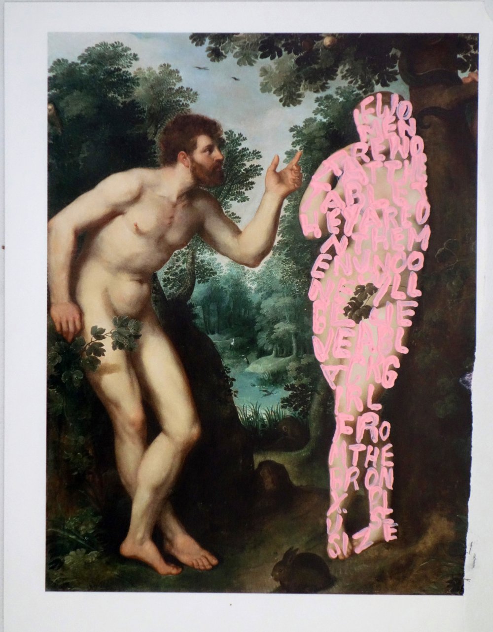 Betty Tompkins, Women Words (Rubens #3), 2018, acryl op boekpagina, 26 x 20 cm, Courtesy galerie rodolphe janssen and the Artist.
