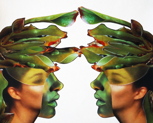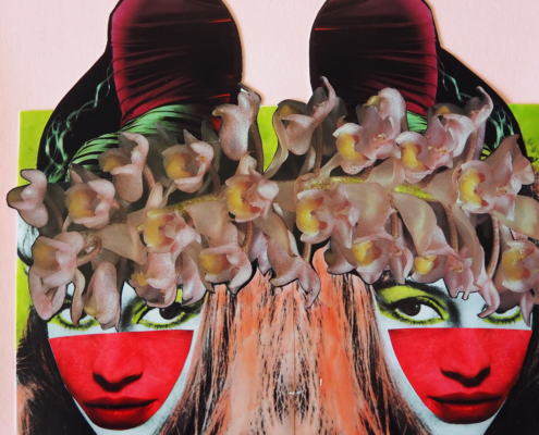Ze vervreemdt deze beelden door ze te veranderen van vorm en kleur. Daarna verwerkt ze deze in de collages met regelmatig absurdistische trekjes. Dit geeft een bizar resultaat, iets dat prikkelend werkt bij de bezoeker.