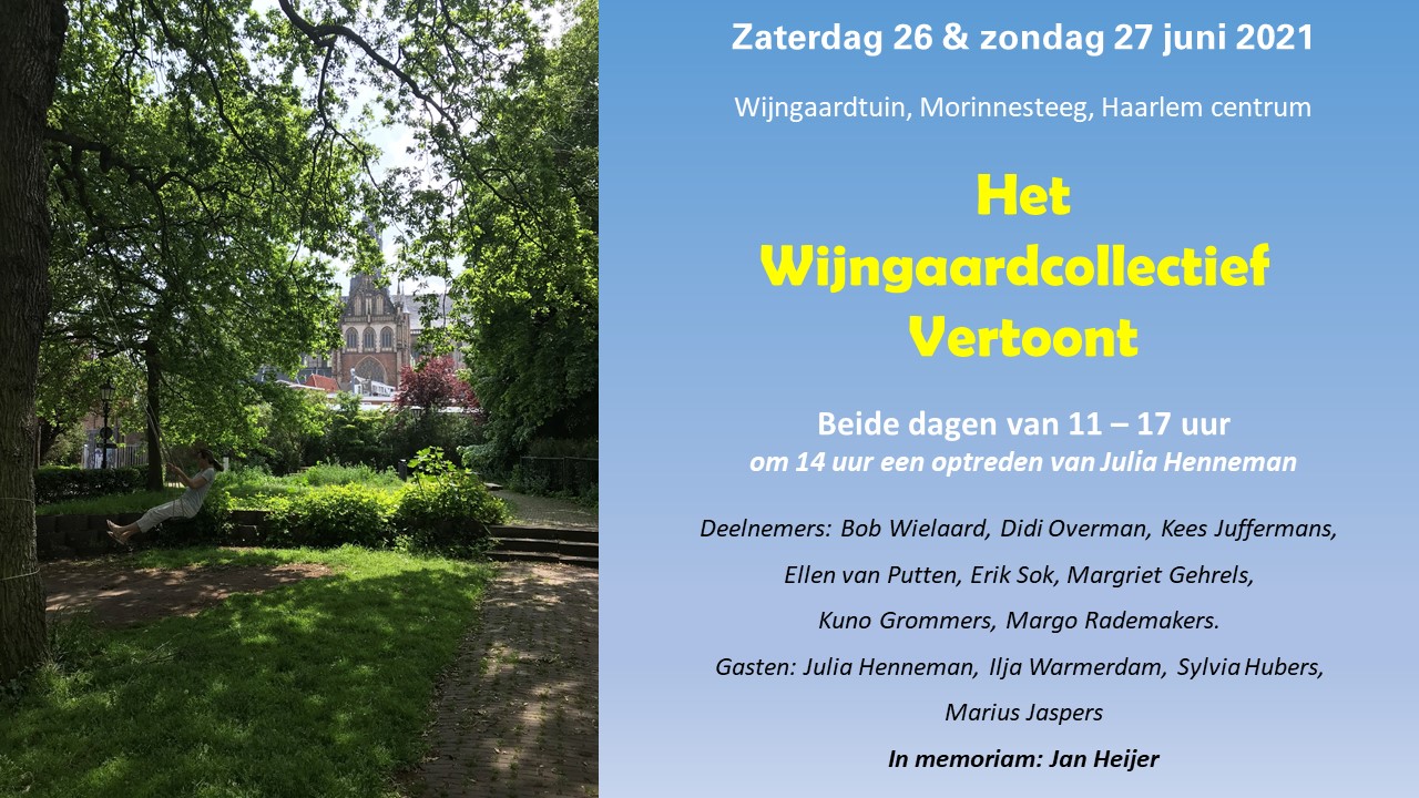 De Wijngaardtuin grenst aan de Morinnesteeg in Haarlem. De openlucht-expositie is beide dagen geopend van elf tot vijf uur. Wees welkom!