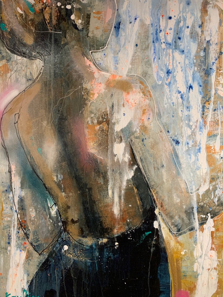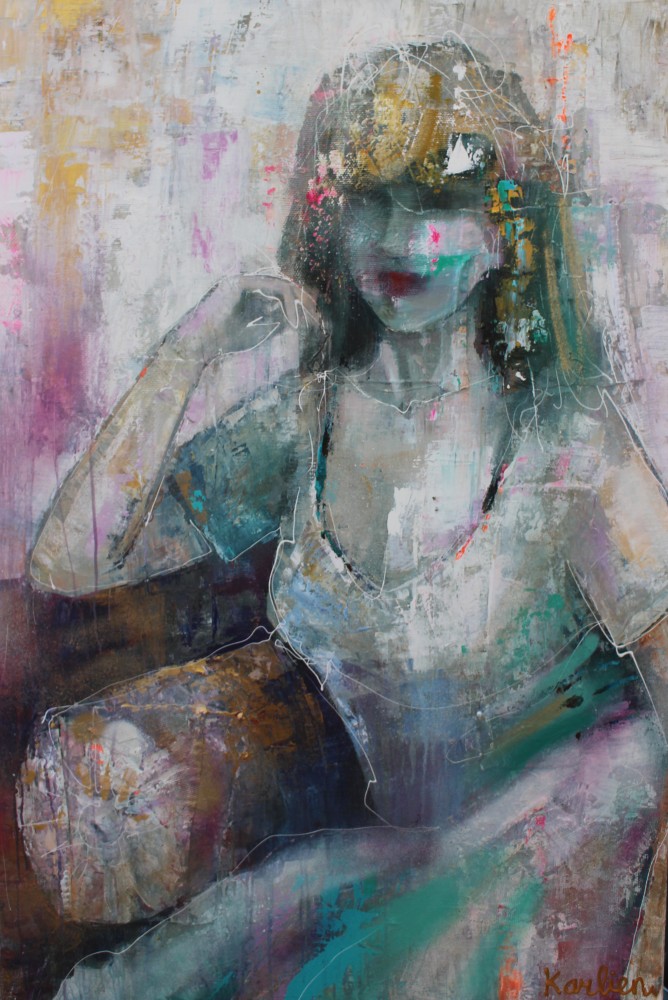 De rumoerige pleinen en volle straten gaven haar inspiratie en vormden een basis. Ze vertrok uit de stad, maar nam de inspiratie mee naar Laren – haar geboortegrond en thuishaven. Het atelier in Laren is als een laboratorium van beeld, waar Karlien elke dag vol energie en passie aan het werk gaat. Ze experimenteert met allerhande materialen en mengt acrylverf met energie en jeu. Bourgondische taferelen geeft ze een moderne, frisse jas, waarin humor nooit ver weg mag zijn. De beelden die in haar hoofd opduiken vertaalt ze naar het linnen. Schilderen op intuïtie dat is haar kracht en kenmerkend voor het werk.