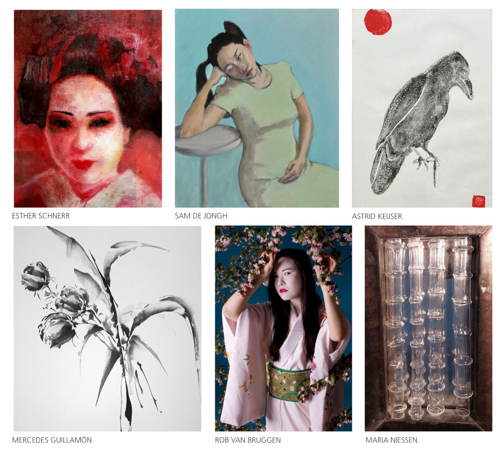 Van Esther Schnerr zijn er een aantal schilderijen, waaronder een intiem portret in rood tinten van een Geisha. Ook Astrid Keijser koos daarvoor , maar dan een uitvoering in keramiek, met een grote metalen zon van goud als achtergrond, titel :‘Land of the Rising Sun’. Van haar zien we tevens een aantal monoprints, die een Japanse sfeer uitstralen. Maria Niessen maakte bamboe van glas en van Marja ten Hoorn is een linoprint te bewonderen van een goudvis.