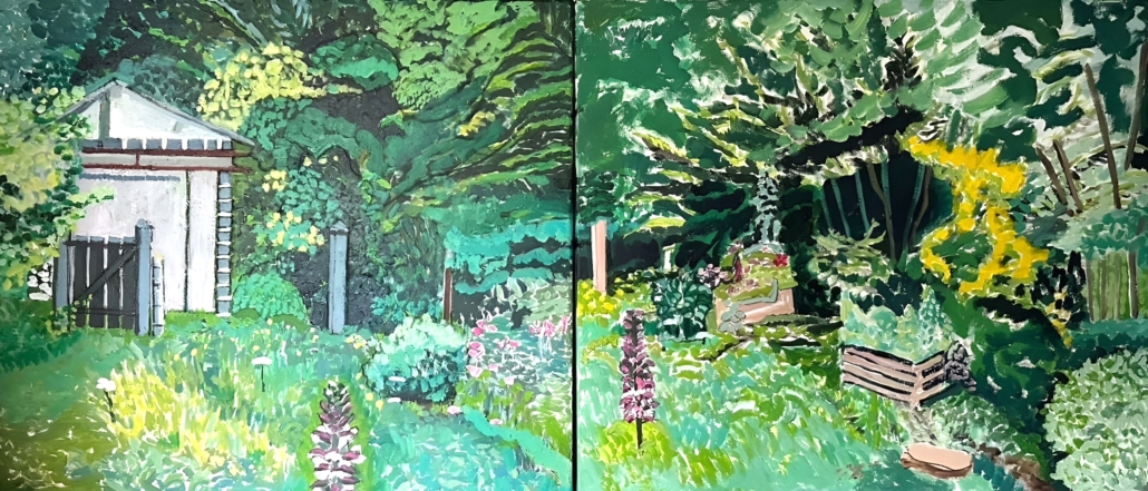 Afke Spaargaren heeft in Vaucottes sur Mer, Normandië, twee oudere doeken overgeschilderd. De aanleiding was dat er twee bomen omgekapt waren en ze heeft de nieuwe situatie vastgelegd. Afke ontdekte daar midden in het gras een mooie bloem, de Acanthus mollis. De vakantie van Henk Zwanenburg in Zwitserland heeft een berg aan inspiratie voor nieuwe schilderijen opgeleverd. In zijn werken schetst hij vaak landschappen met daarin een auto, trein of boot. John van den Goorbergh woont en werkt in IJmuiden en de zee heeft in zijn leven altijd een grote rol gespeeld. Zijn betrokkenheid bij het water blijkt ook overduidelijk uit zijn schilderijen, aquarellen en tekeningen.