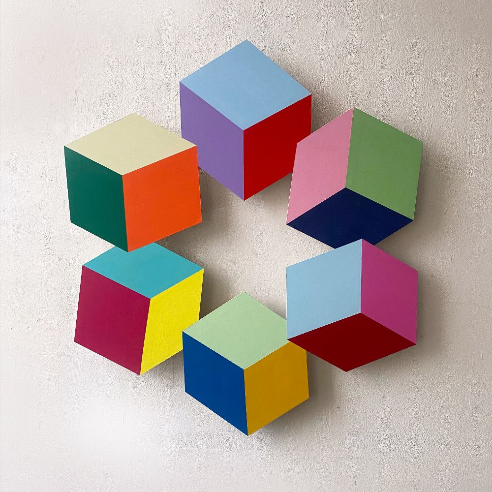 De wandobjecten zijn gemaakt van opengewerkt plaatmateriaal, beschilderd met geometrische vormen. De schaduw die ontstaat door de uitgesneden vormen speelt een belangrijke rol in haar werk. Het vergroot het ruimtelijk effect en vormt een zacht contrast met de harde lijnen en vlakken. Bovendien verbindt de schaduw het werk met de muur waaraan het hangt.