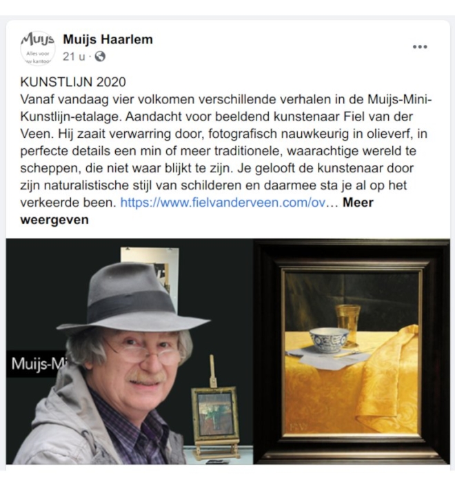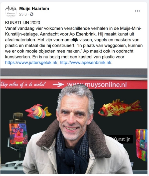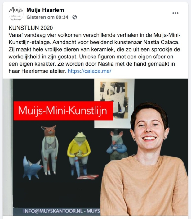 Tot 27 oktober zijn verschillende verhalen terug te vinden in de Muijs-Mini-Kunstlijn-etalage met werken van Nastia Calaca, Harm van Ee, Ap Esenbrink en Fiel van der Veen. Meer informatie is te vinden op de Facebook pagina van Muijs Kantoor & Kado