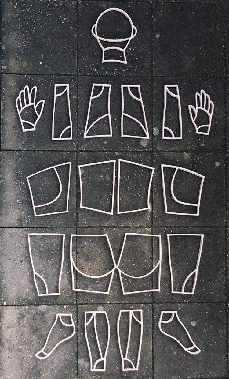 Het lichaam is gemaakt van stroken klei en verdeeld in stukken als een puzzel of ex voto, een spel van vorm en betekenis. Het lichaam ligt uitgestrekt, in slaap of reikt het zover mogelijk, zijn er grenzen of rust het uit van de chaos van het leven, verdwaald in de tijd.