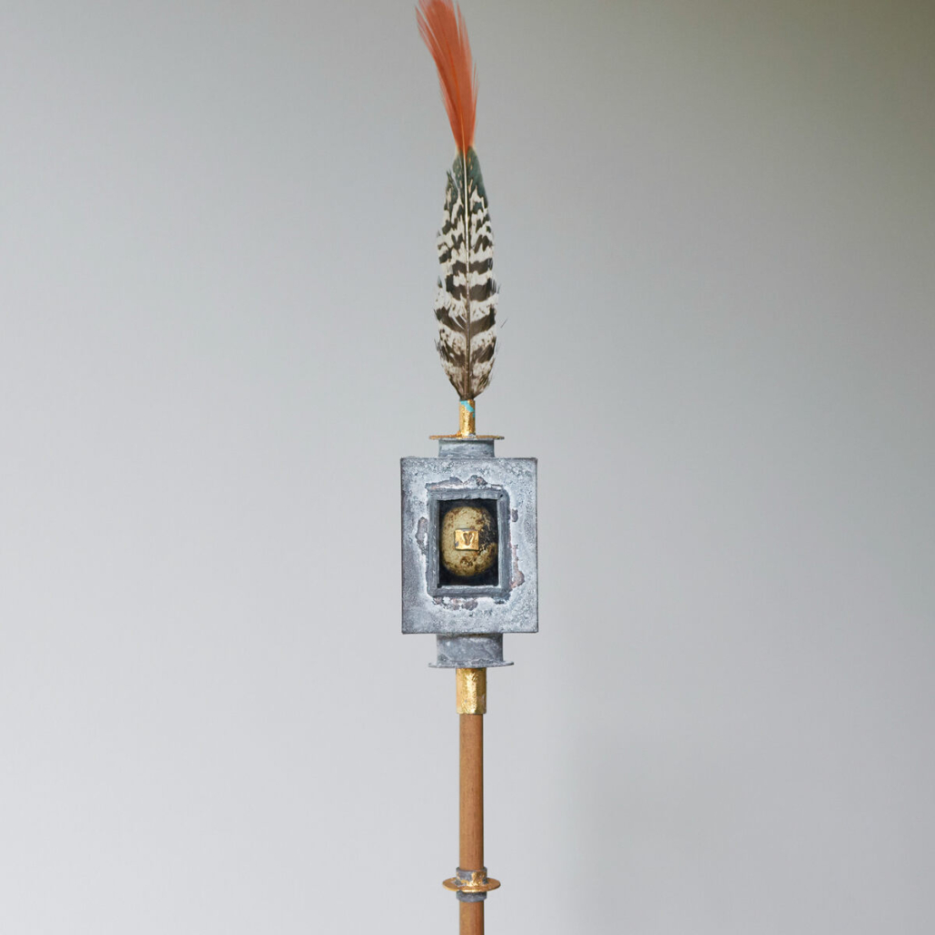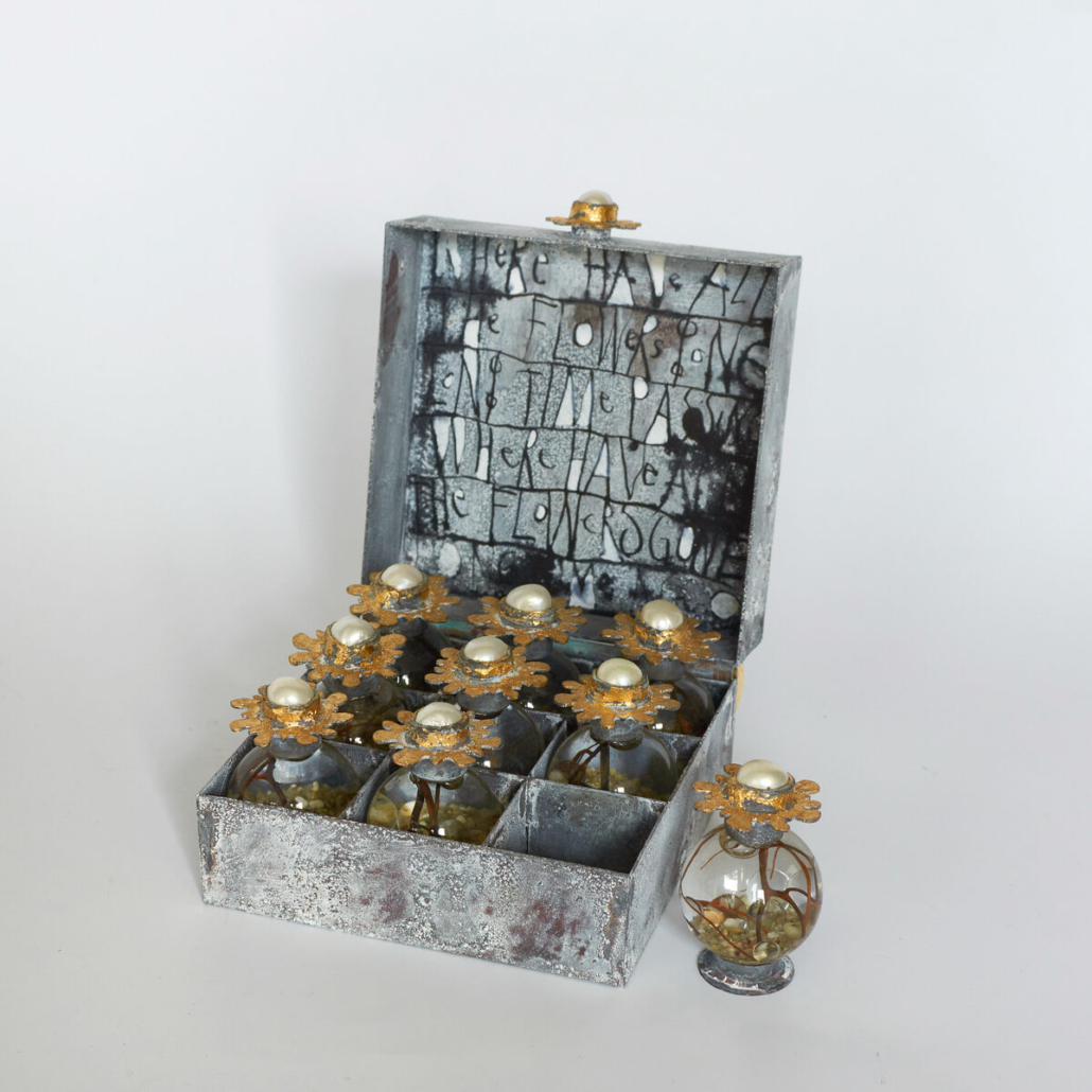 Door het met zuur behandelde zink en gescheurd bladgoud lijken ze op oude, verweerde schatten. Waar het hem om gaat is iets mooi en geheimzinnig te maken, een verborgen verhaal, een ziel, aan het object mee te geven.
