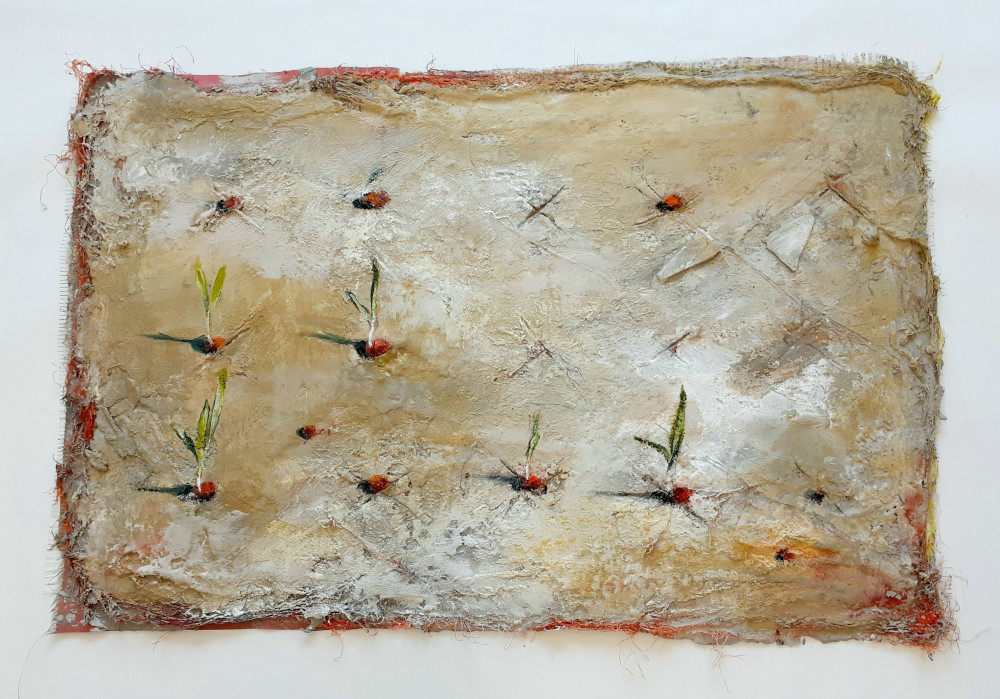 Zonder metaforen of symbolen verbeeldt zij dit toekomstbeeld op papier en plastics gecombineerd met bijenwas en olieverf.