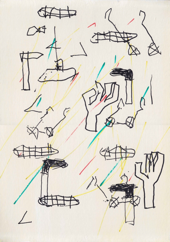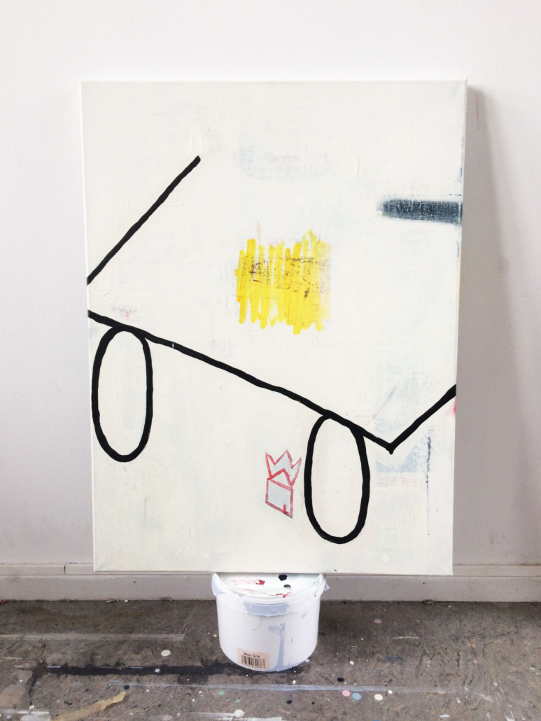 Daar stond hij ineens, midden in de supermarkt tegen iemand aan te praten. “Hoe ben ik hier terecht gekomen en waar zijn mijn spullen?” Na een lange brief wisseling met collega kunstenaar Dries Gijsels in Brussel begonnen de puzzelstukjes pas echt verre van op zijn plaats te vallen. Haarlem, Amsterdam, Brussel. Geïnspireerd door de New York School, DIY cultuur en grafische beeldtaal, creëert hij middels cryptische vormen en een onbevangen schilder en tekentechniek, een autobiografisch verhaal. Het brandende huis, onderweg zijn, de flirt met de grote stad en tegelijkertijd de behoefte aan afzondering. Bij deze rafelranden ontstaan er nieuwe interactie’s tussen losse illustratieve lijnen en geometrische vlakken. Er wordt gerefereerd naar een plek in beweging. Door het aanbrengen, weghalen, bedekken en overschilderen van deze bouwstenen worden zij op een nieuwe manier herenigd. Het voortbouwen op toevalligheden en uitschieters is een wezenlijk onderdeel van dit proces.