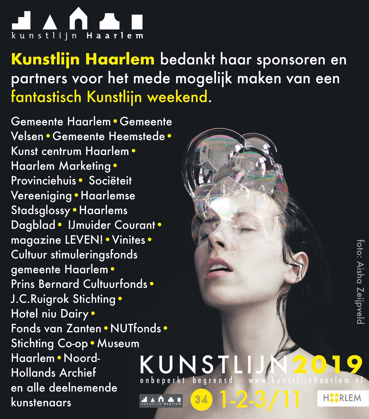 Het Kunstlijn team wil alle deelnemende kunstenaars en locaties, de curatoren, gemeente Haarlem, Kunst centrum Haarlem, Haarlem Marketing, het Haarlems Dagblad en de IJmuider Courant, Vinites en al haar adverteerders en partners enorm bedanken voor hun grote inzet om dit evenement ook dit jaar tot een groot succes te maken.