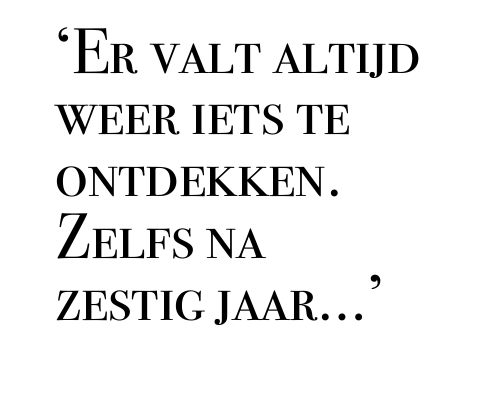 Eric blijft schilderen, kijken en kantelen. Zijn werken zijn de laatste jaren in het algemeen iets kleiner geworden, iets overzichtelijker. “En ook iets helderder en lichter van toon”, merkt Marja op. “Maar soms gooi ik er gewoon een baal verf overheen”, zegt Eric lachend terwijl hij naar zijn werken om zich heen kijkt. “Ik vraag mij wel eens af, heb ik niet genoeg geschilderd? Toch valt er altijd weer iets te ontdekken. Zelfs na zestig jaar.”