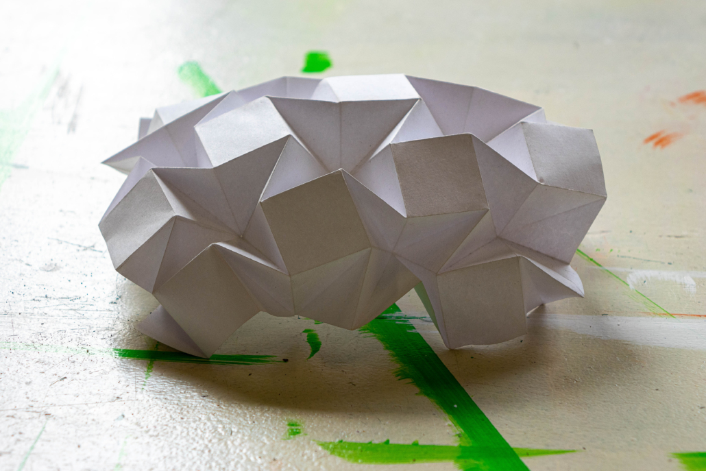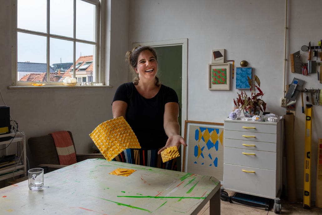 “Mijn werk voor de expositie en het boek zijn klaar. Het was nog een heel gedoe om tijdens de coronacrisis plexiglas te laten bewerken. De werkplaatsen waren overvraagd en de deadline naderde. Wat een stress, niet te doen. Op het moment ben ik met wiskundig origami bezig. Het ziet er heel ingewikkeld uit, maar is volkomen logisch. Je moet de handeling van het vouwen wel fijn vinden, zeker bij zo’n moeilijke. Als je wacht tot het klaar is, werkt dat frustrerend. Met de logica van deze werkjes weet je waar je uitkomt, dat is niet zo met kunst. Aan het begin van een nieuwe werk, weet je niet waar het heen gaat. Dat geeft onzekerheid en is juist leuk. Als je weet waar het eindigt, bestaat het al en waarom zou je het werk dan nog maken?!”