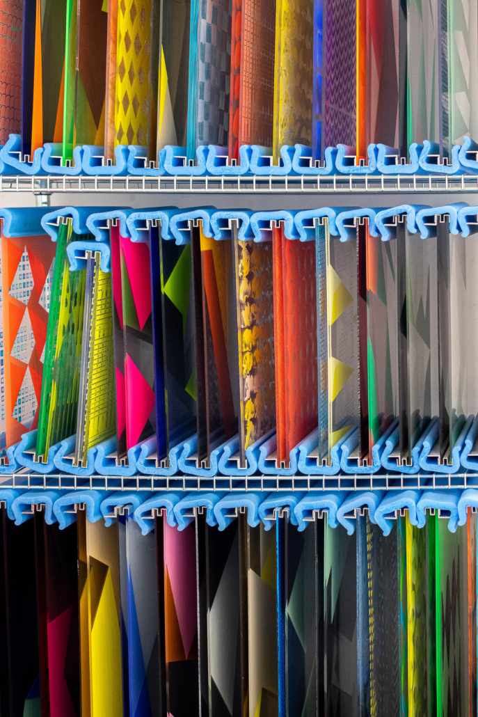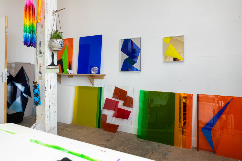 “Met lagen werken op doek is lastig. De verf die ik aanbracht, kon ik later niet meer verwijderen als het tegenviel. Ik ben kleine plastic sheets gaan maken met diverse kleuren en patronen. Door ze voor het schilderij te houden, kon ik kijken of het werkte wat ik bedacht had en zo controle krijgen over het effect van de lagen. De sheets waren van glad plastic, dat werkte super snel. Ik maakte er 40 op een dag. In totaal heb ik er wel 400 gemaakt. De sheets vormden een soort beeldbank, de hele muur in mijn oude studio hing er vol mee. Door het vlotte werken ging mijn ontwikkelingsproces ook plots snel en vond ik doek niet meer interessant. Ook ontdekte ik door verschillende sheets voor een schilderij te houden hoe goed lagen werken met ruimte ertussen. Het plastic bleek uiteindelijk te dun en de verf liet snel los, dus ben ik op zoek gegaan naar iets anders en kwam bij plexiglas uit.”