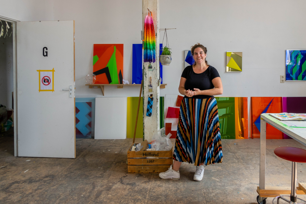 In haar atelier hangen schilderijen uit 2018 en 2019 en een enkele grotere uit 2020. De studio is licht en ruim, er heerst rust. Ze heeft geen straatzicht en dus ook geen afleiding van de buitenwereld. “Eigenlijk is dat heel prettig, mijn concentratie is groter dan in mijn oude studio op de begane grond aan het Spaarne. Ik werk hier iedere dag met een dikke grijns op mijn gezicht, het geeft zo veel energie.”