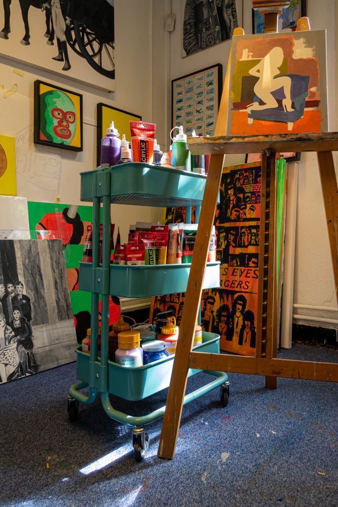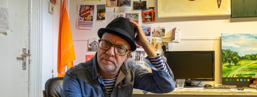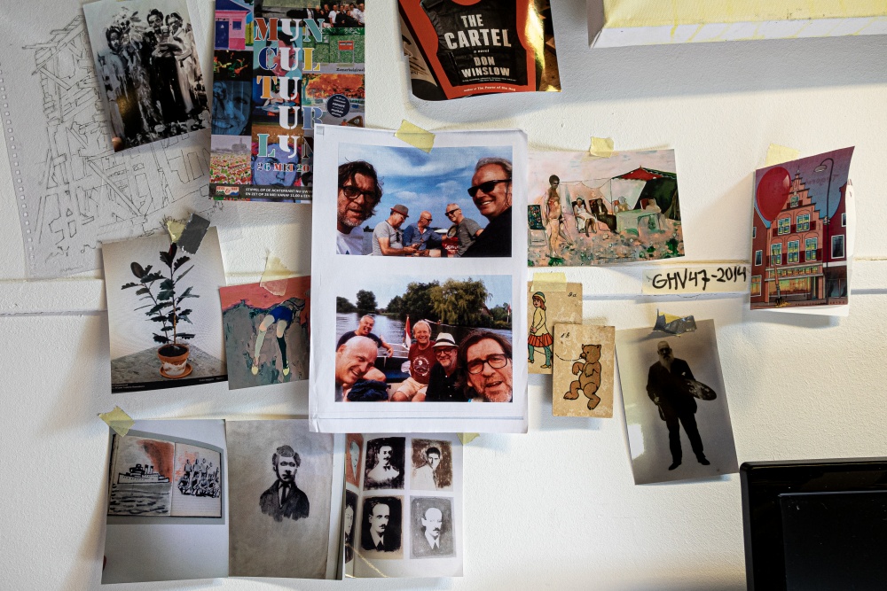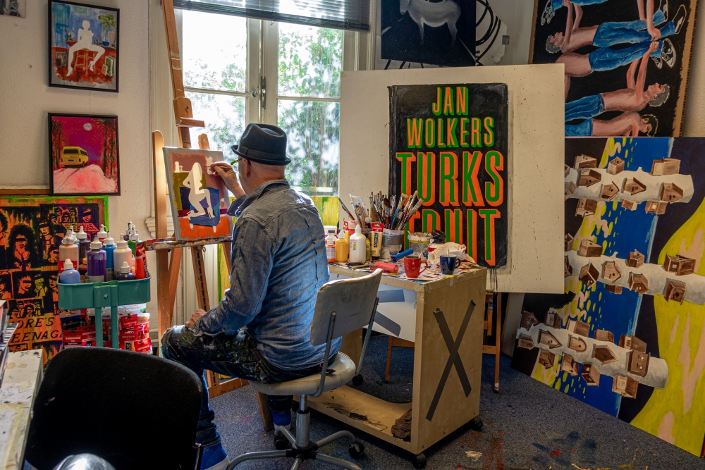 “Mijn werk is duidelijk gemaakt door een man”, zegt hij lachend. “Dat zit ‘m in de zienswijze of benaderingswijze. Een vrouw zal niet snel zo’n astronaut in het oerwoud schilderen.” Hij wijst op een doek aan de muur. “Het heeft iets te maken met het filmische waarvan ik denk dat mannen dat meer hebben. Ik bevind me nu wel op gevaarlijk terrein met deze opmerking.” De kunstenaar haalt vier grote schilderijen tevoorschijn. “Dat geldt ook voor deze serie met als titel Punkplateau. Vroeger was ik zelf punker en zat in allerlei bandjes. Mijn thematiek is jongensachtig, dat komt misschien ook omdat ik me nog steeds een jongen voel, al ben ik zestig.”
