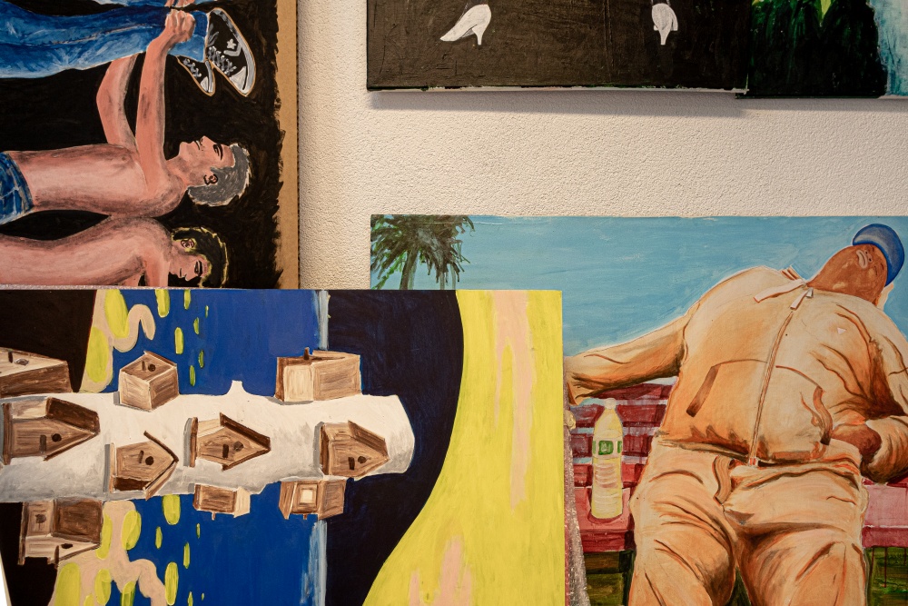 Op een groot doek is een forse man uitgebeeld onderuitgezakt op een bankje in een park. “Is de man dronken? Is het een zwerver of een aanklacht tegen obesitas? Het is niet direct duidelijk wat ik verbeeld. Voor mij is het gehele tafereel interessant om over te fantaseren: de locatie, de verschijning, de kleuren. Er zitten codes in verwerkt: het trainingspak refereert aan een bepaalde levensstijl en overdag slapen in het park, daar hebben mensen een beeld bij: de man is vast een loser of juist zielig.”