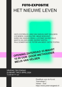 13 kunstenaars geven hun visie op Het Nieuwe Leven in het Raadhuis voor de Kunst in Oud-Velsen. Hoe ziet de huidige wereld eruit, hoe beweegt de mens zich daarin en wat is het verschil met vroeger? Dat is het thema van de nieuwste tentoonstelling georganiseerd door Pietervan Geest, bekend van de Visserhallen te IJmuiden. Het thema wordt door elke exposant op verschillende wijze in beeld gebracht. In klassieke zwart-wit fotografie bij Sietse Postma en als poëzie bij Anita Oosterloo. Vele…