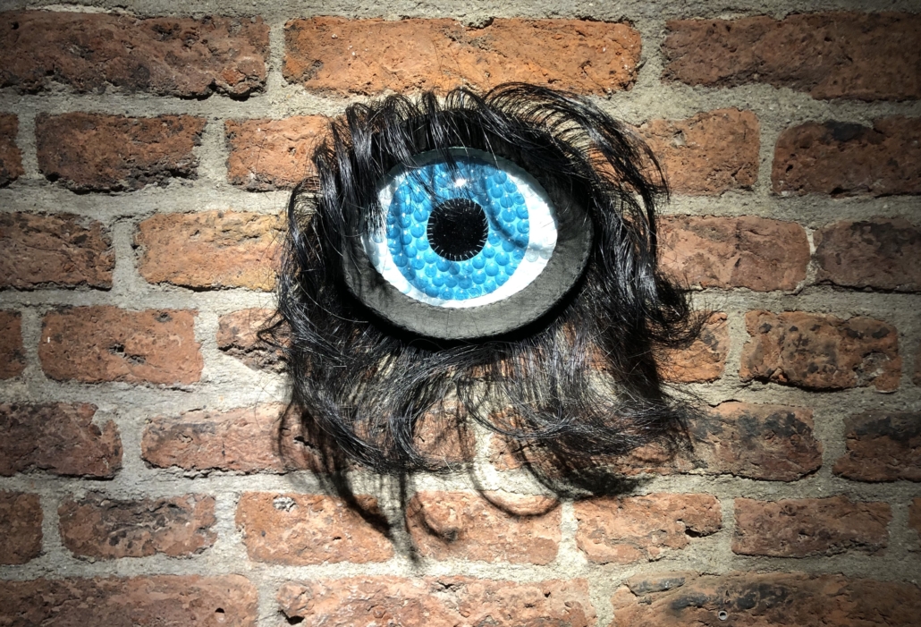Knal. Bam. De eerste klap is een daalder waard. In het intieme nisje schuin achter de balie hangt ‘Blauw oog‘ van Linda Molenaar. Gemaakt van ‘getrenst paardenhaar uit gebruikte strijkstokken’, contactlenzen, leer en glas.