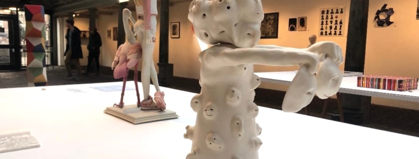In het midden van de zaal vinden we driedimensionale werken van diverse pluimage, van sieraden tot sculpturen. ‘Please, tell me who I am‘ van Chrystl Rijkeboer springt er voor mij uit: een figuur met ontelbare gezichtjes als uitstulpingen, de armen strekkend waar eveneens met beide handen een gelaat wordt getoond. Wie zijn wij, waar komen we vandaan en waar gaan we heen? Al die gezichten die we in het huidige tijdsgewricht moeten tonen en ophouden, daar kun je vermoeid en verward van raken.