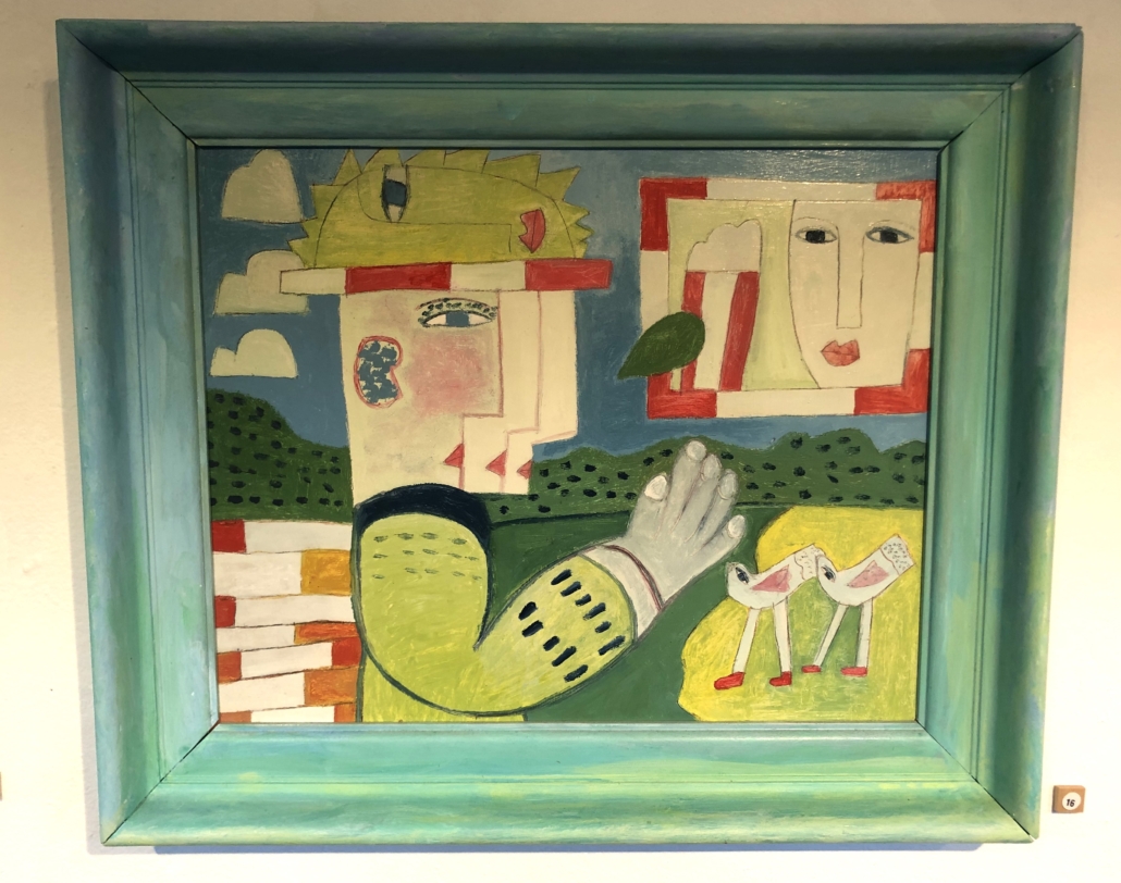 Tja en dat er dan een werk van Hannes Kuiper tussen hangt stemt deze razende reporter steevast vrolijk. ‘Zelfportret met ander portret‘, acryl op paneel. Het is opnieuw een ode aan de vrije fantasie waarin de werkelijkheid niet van belang is. Immers: de echte Hannes heeft lange (inmiddels aardig grijze maar hier en daar nog steeds wilde) haren. Het ‘ander portret’ is een dame die naar de ‘zelf’ lijkt te zwaaien. Vrolijke vogels komen aangetrippeld.
