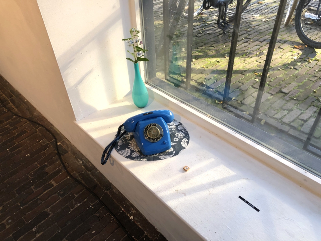 ‘Is het gelegen?‘ is de titel van het werk in de vensterbank, bedacht door het aanstormend talent Madelief van de Beek. ‘Ga zitten’ is te lezen in die vensterbank, woorden geprint met zo’n ouderwetse lettertang. Het kunstwerk is een vintage blauwe telefoon-met-draaischijf zoals we ze in de jaren zeventig pleegden te gebruiken. ‘Pak op’ staat er te lezen op de hoorn. En als je dan die hoorn naar je oor brengt hoor je iemand voor zich uit murmelen in een onbegrijpelijke monoloog. “Dat mensen soms maatschappij-berichten inspreken en jij vervolgens allerlei vaagheden hoort waar je geen touw aan vast kunt knopen, dat ergert me”, verduidelijkt Madelief. Chaos in de communicatie van vandaag de dag op kunstzinnige wijze verbeeld. Goed ding.