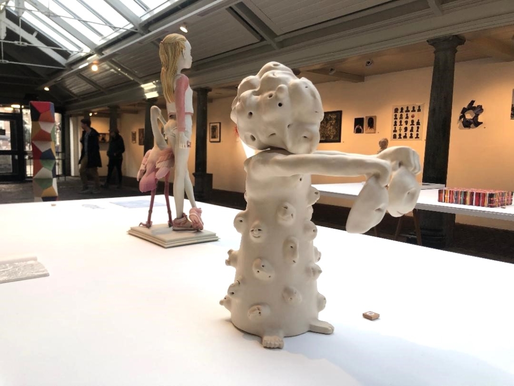 In het midden van de zaal vinden we driedimensionale werken van diverse pluimage, van sieraden tot sculpturen. ‘Please, tell me who I am‘ van Chrystl Rijkeboer springt er voor mij uit: een figuur met ontelbare gezichtjes als uitstulpingen, de armen strekkend waar eveneens met beide handen een gelaat wordt getoond. Wie zijn wij, waar komen we vandaan en waar gaan we heen? Al die gezichten die we in het huidige tijdsgewricht moeten tonen en ophouden, daar kun je vermoeid en verward van raken.