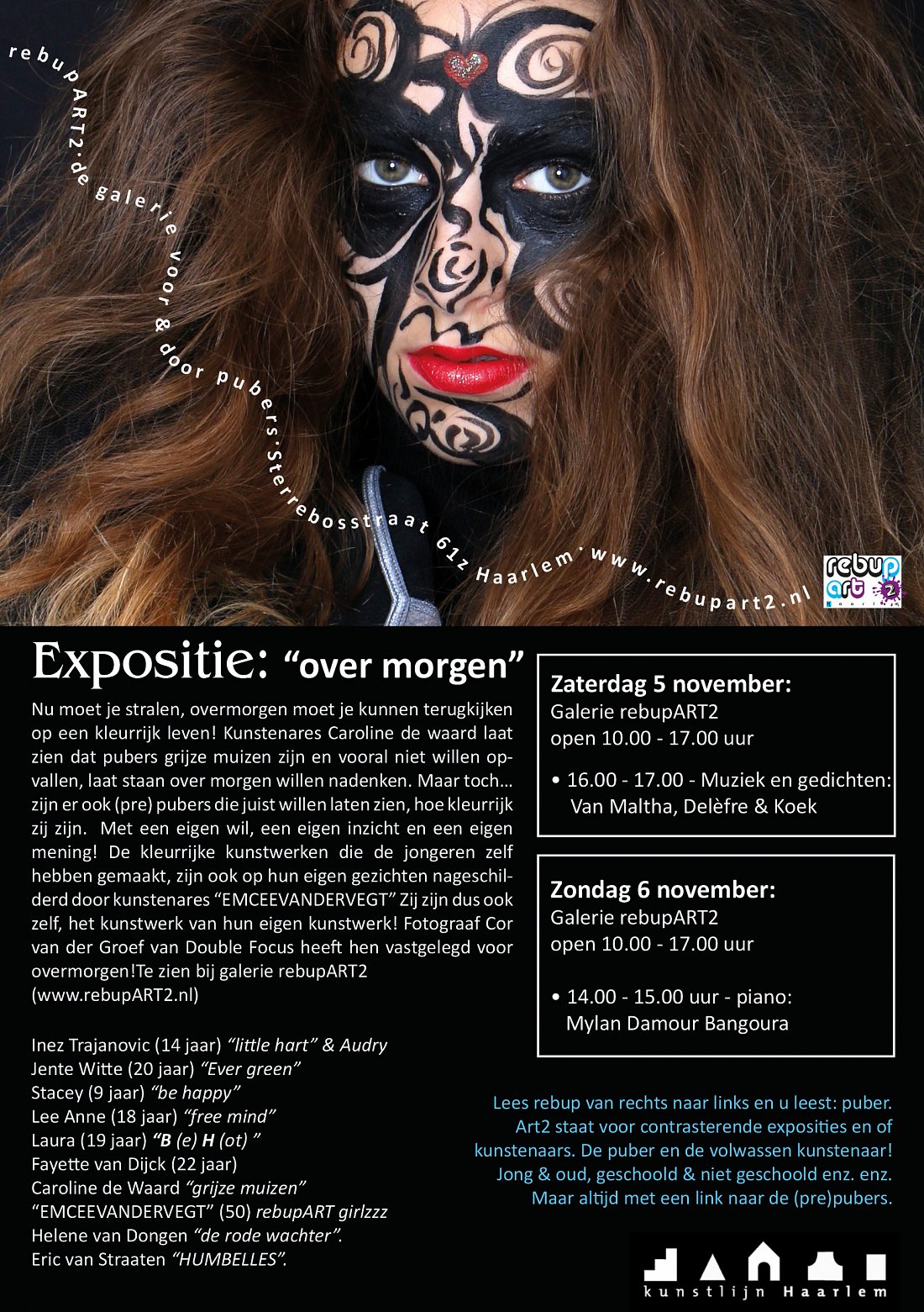 De kleurrijke kunstwerken die de jongeren zelf hebben gemaakt, zijn ook op hun eigen gezichten nageschilderd door kunstenares “VANDERVEGT” Zij zijn dus ook zelf, het kunstwerk van hun eigen kunstwerk! Fotograaf Cor van der Groef van Double Focus heeft hen vastgelegd voor overmorgen! Te zien bij galerie rebupART2 (www.rebup.nl)