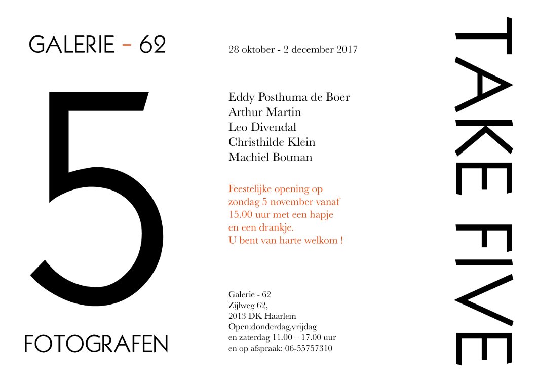 Onder de noemer ‘ Take Five’ toont Galerie – 62 rond de Haarlemse Kunstlijn het werk van vijf nationaal en internationaal befaamde fotografen voor wie de camera vooral een verlengstuk van hun oog is. Zij kiezen ieder voor zicht voor het juiste ogenblik, het juiste moment. Voor hen is de camera het werktuig om binnen de begrenzing van een enkele foto de hele essentie te pakken van een situatie die bezig was zich voor hun ogen te ontrollen.