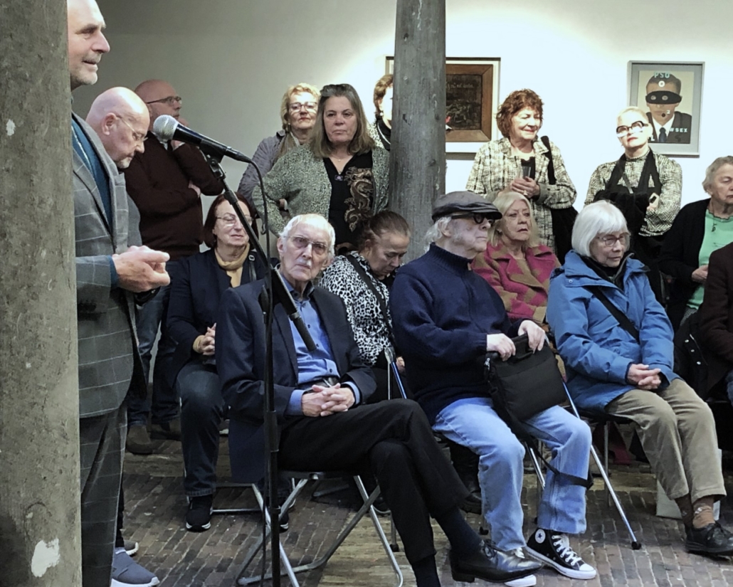 Marinus Fuit en Reinier Lucassen tijdens de opening van de tentoonstelling. Daarachter leunend tegen de pilaar Arjanne van der Spek.