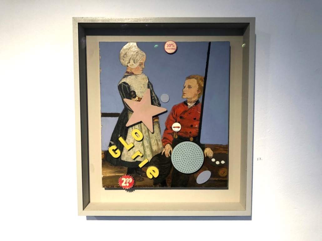 Assemblages van Lucassen doen de mondhoeken krullen, al was het alleen maar om de maffe titels van de werken. Neem bijvoorbeeld het werk ‘Nederland is gefundeerd op boeren en kruideniers, nijvere cententellers en dwangneurotische spaarders‘ uit 2014. Een jongedame in Volendams kostuum kijkt meewarig een jongeman aan, die niet overloopt van activiteit. Ogenschijnlijk willekeurige sterren, stickers (‘30% korting’) en buttons (‘Jaguar coupé’) sieren het geheel. Het is vermakelijk cynisme, zoals ook bij het werk ‘De dood van Winnetou (de nobele wilde)‘, waarop vloeiende abstracte vormen te zien zijn met op de achtergrond een pastiche van ‘Het Zigeunerinnetje’ van Frans Hals (door sommigen verward met ‘Malle Babbe’, maar dit terzijde).
