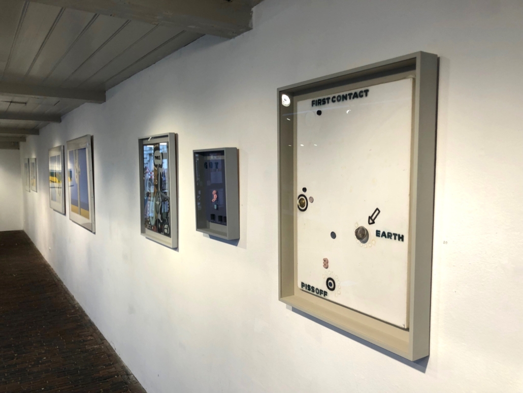 Ernaast hangt een overwegend wit geschilderde ‘assemblage’ met daarop de typische beeldtaal van Lucassen: letters, cirkels, cijfers. ‘First contact – De eerste boodschap van naar de aarde gezonden door buitenaardse intelligentsia: Piss off!‘, is de titel. Want de mens is in feite ‘een mislukt product’, heeft de kunstenaar zich weleens in een interview laten ontvallen.