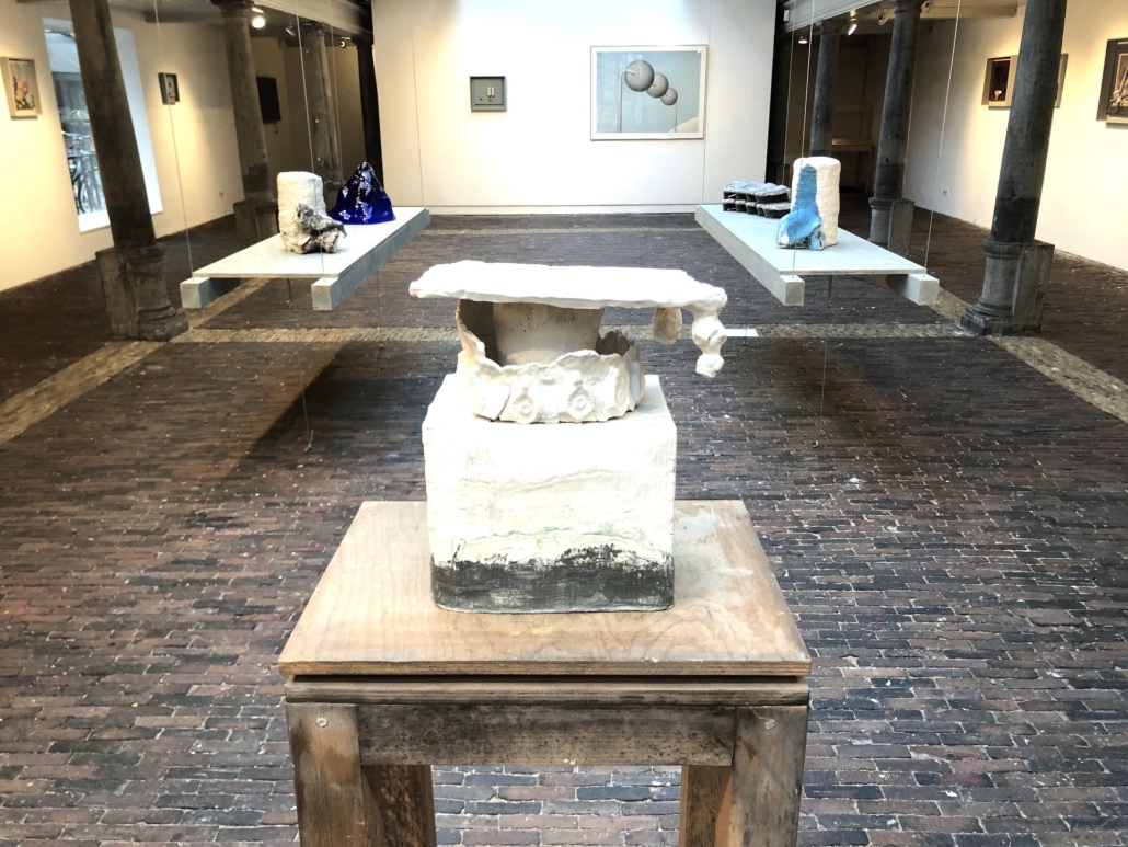 Arjanne van der Spek (Rotterdam, 1958) is op deze tentoonstelling vertegenwoordigd met keramiek en kunst gemaakt van porselein, geblazen glas en aluminium. De installatie met objecten en werken in de serie ‘gemengde techniek op papier) bewegen zich tussen abstractie en figuratief. De installatie in het midden van de ruimte bestaat uit werken op vier ‘zwevende’ tafels en middenin een werk op een sokkel getiteld ‘De nieuwe herhaling’. Voor haar gaat kunst over ‘verpersoonlijking en verbinding met ‘de massa’, de anderen’. De kunstwerken van Arjanne zullen de meeste vragen bij de kijker oproepen, zoveel is duidelijk. In die zin heeft curator Aart van der Kuijl het weer slim aangepakt: hij brengt onze verwende hoofden in aanraking met kunst waar je op moet kauwen.