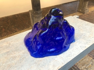 Naar de betekenis van titels als ‘Stofdroom‘, ‘Mobiushond‘ of ‘Bui‘ mogen we gissen. Een mooie vorm heeft het werk ‘Bui’ zeker, als een soort oprijzende berg in Yves Klein Blauw (International Klein Blue) of massief neerdalend stuk neerslag, hetgeen een voorteken zou kunnen zijn van het onheil dat ons te wachten staat als we niet eens aan de gang gaan met klimaatadaptie of de vermindering van uitstoot.
