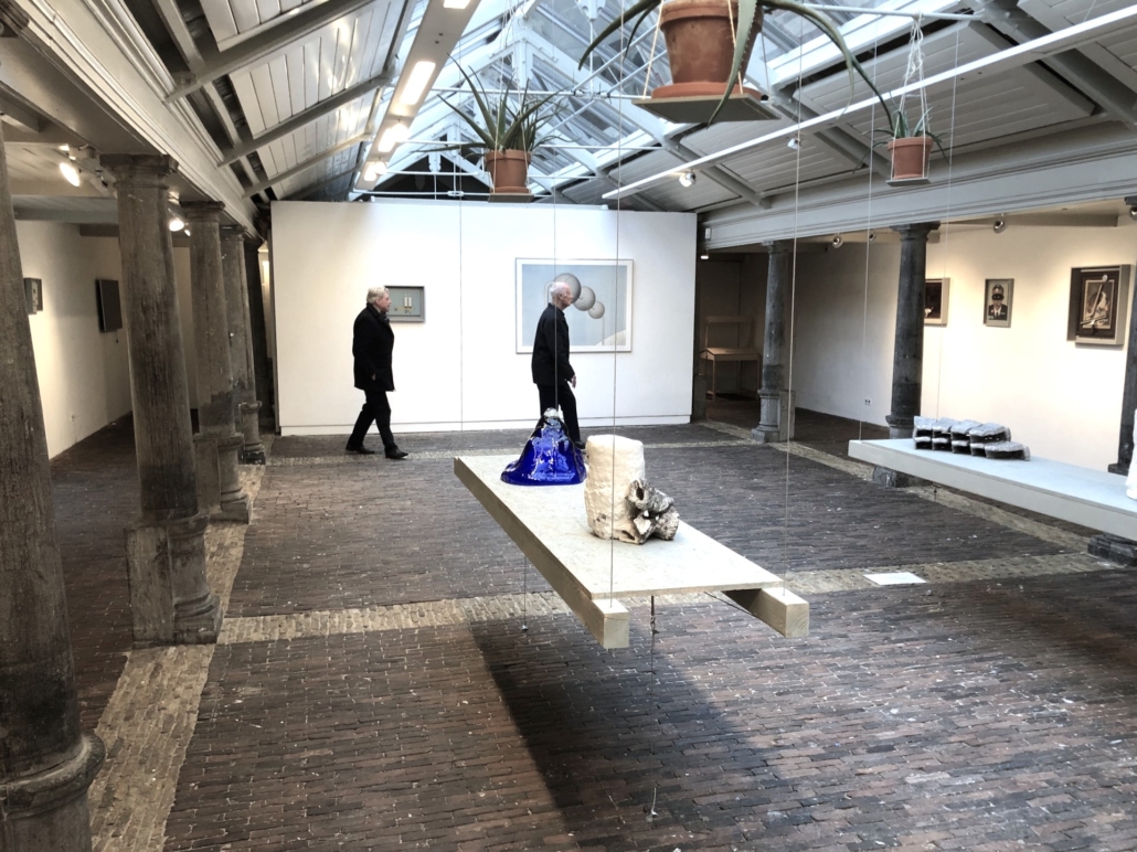 Arjanne van der Spek (Rotterdam, 1958) is op deze tentoonstelling vertegenwoordigd met keramiek en kunst gemaakt van porselein, geblazen glas en aluminium. De installatie met objecten en werken in de serie ‘gemengde techniek op papier) bewegen zich tussen abstractie en figuratief. De installatie in het midden van de ruimte bestaat uit werken op vier ‘zwevende’ tafels en middenin een werk op een sokkel getiteld ‘De nieuwe herhaling’. Voor haar gaat kunst over ‘verpersoonlijking en verbinding met ‘de massa’, de anderen’. De kunstwerken van Arjanne zullen de meeste vragen bij de kijker oproepen, zoveel is duidelijk. In die zin heeft curator Aart van der Kuijl het weer slim aangepakt: hij brengt onze verwende hoofden in aanraking met kunst waar je op moet kauwen.