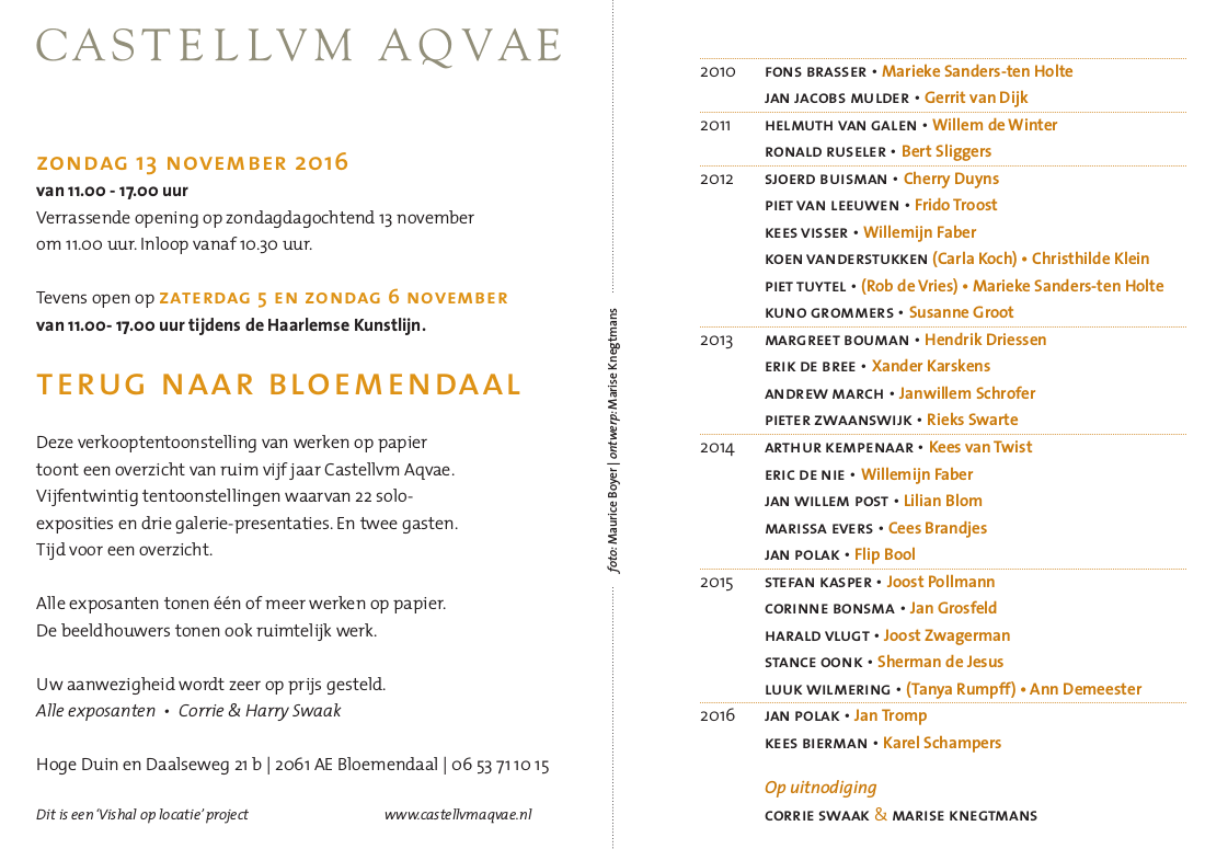 Deze verkooptentoonstelling van werken op papier toont een overzicht van ruim vijf jaar Castellvm Aqvae. Vijfentwintig tentoonstellingen waarvan 22 solo-exposities en drie galerie-presentaties. En twee gasten. Tijd voor een overzicht. Alle exposanten tonen één of meer werken op papier. De beeldhouwers tonen ook ruimtelijk werk.