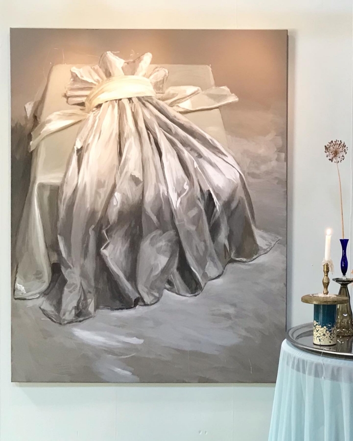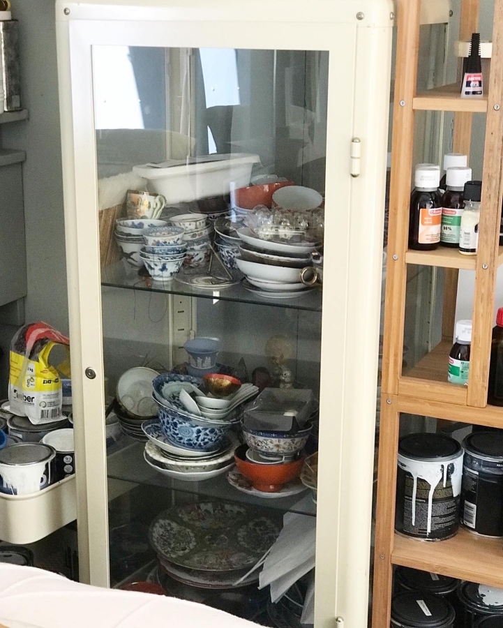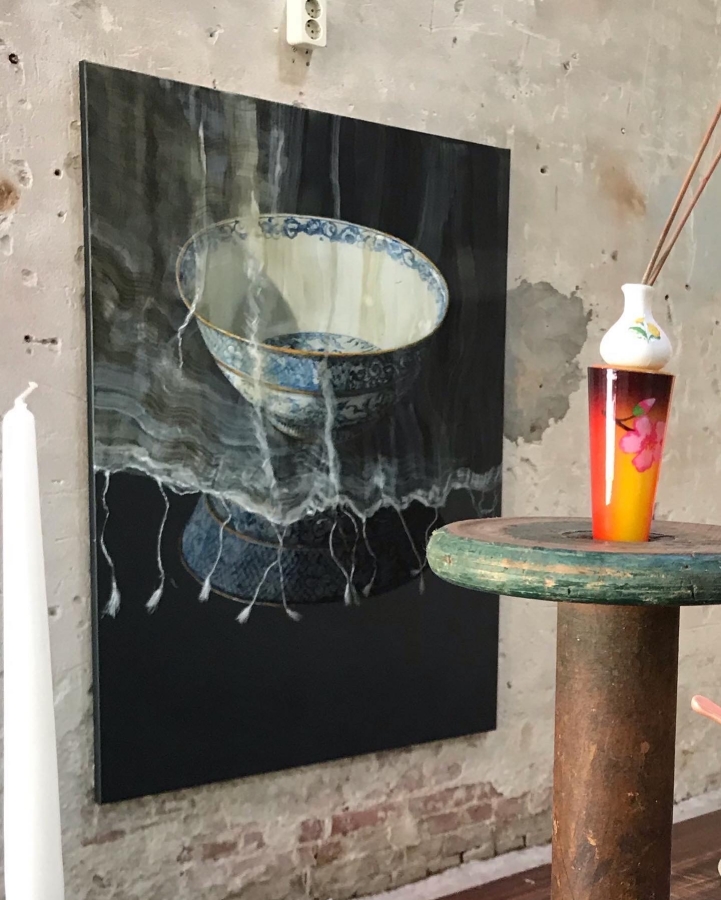 Sasja Wagenaar maakt vaak grote schilderijen. Stillevens van Chinese porseleinen kommetjes. Elk werk heeft een kijk afstand. Dichtbij is het geschilderd, op afstand ziet het er heel fijntjes, realistisch, uit.