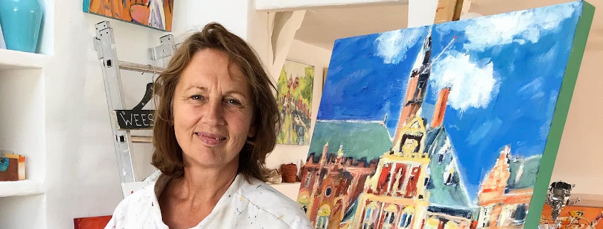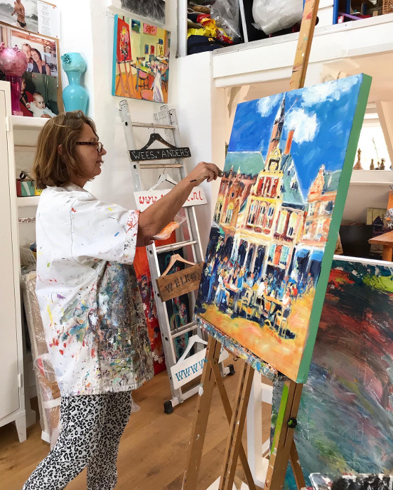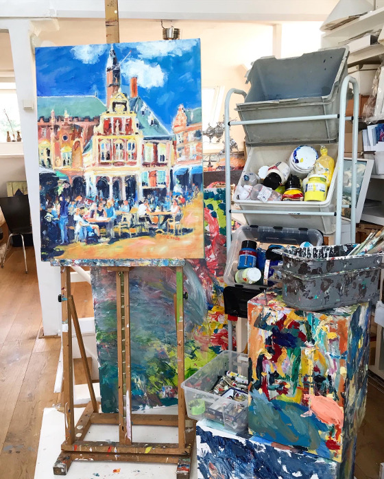 Vera Bruggeman is hier bezig met de laatste hand aan stadsgezicht Terrasje Haarlem, de Grote Markt, zo stil en leeg met de lockdown zo bruisend en levendig in verf op canvas. Haar werk is van 13 augustus t/m 20 september te zien met Expositie ‘Stadsgezichten, … Wereldsteden’ in galerie De Waag. Een expositie op 2 locaties, galerie De Waag en galerie SPW59 …